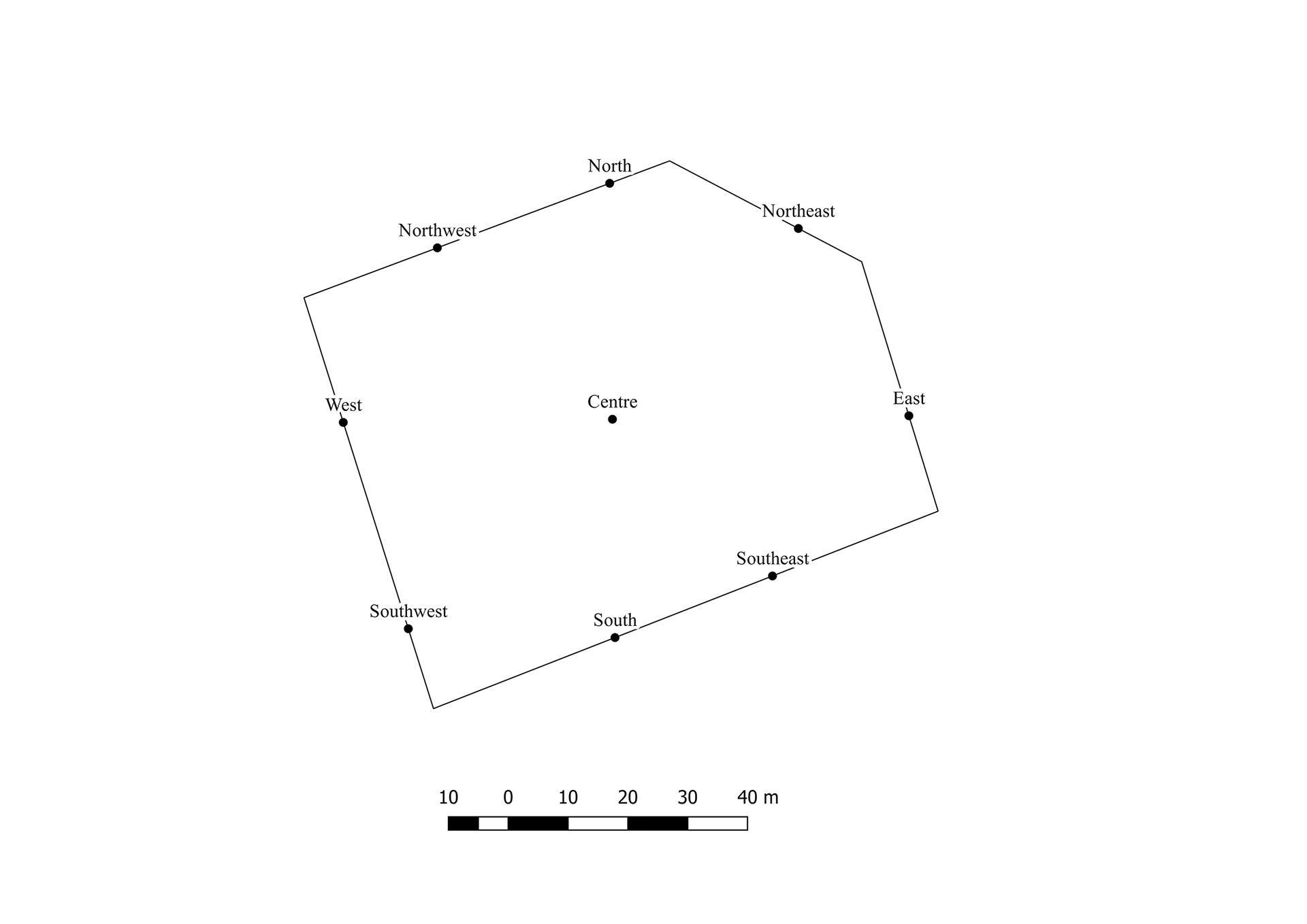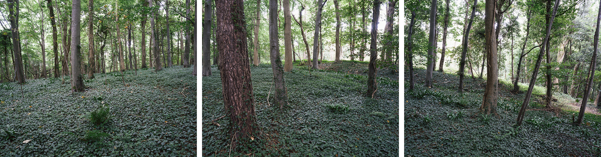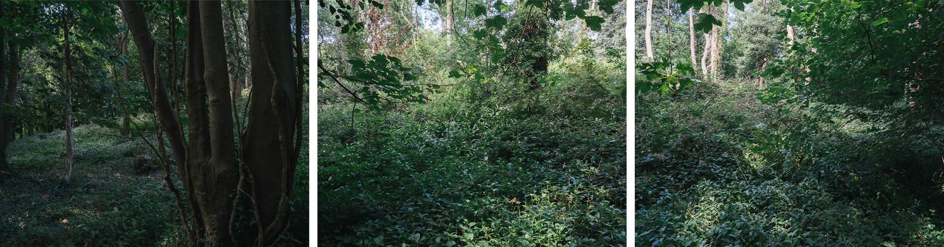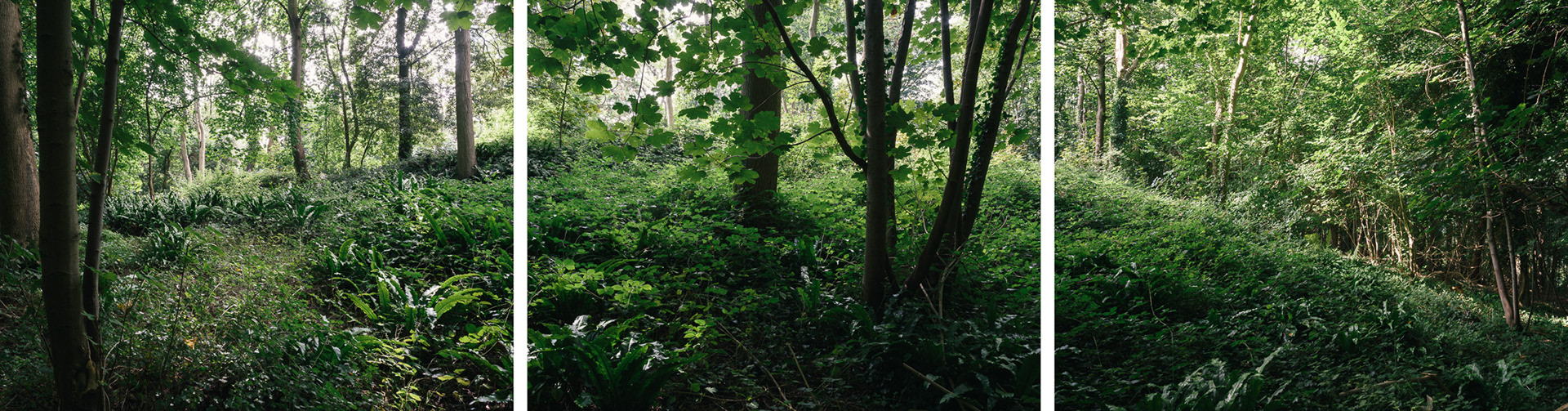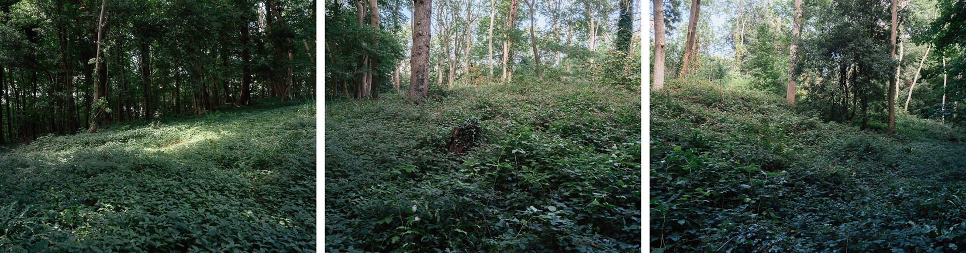 Developing the geo-locative experiments in my previous series ‘Sandford Hill’, this series of photographs is about challenging established photographic methods to begin to understand how photographs are important part of constructing landscapes that reflect an ideal of Beauty. The photographs were made at precise points along the boundary of a scheduled monument. These points were chosen as the intersection between the boundary and lines drawn from the mathematically calculated centre point of the designation area along cardinal (N,S,W,E) and inter-cardinal (NW,NE,SW,SE) compass bearings. At each point, a compass was used to face the camera back towards the centre of the designation and a panoramic triptych representing a one-hundred-and-eighty-degree view from the camera’s vantage point. The resulting landscapes are constructions – the act of placing the three photographs together on a flat field distorts the land as encountered and creates unique landscapes. These resulting landscapes exist as my response to the way in which conservation legislation creates a specific perspective of place.